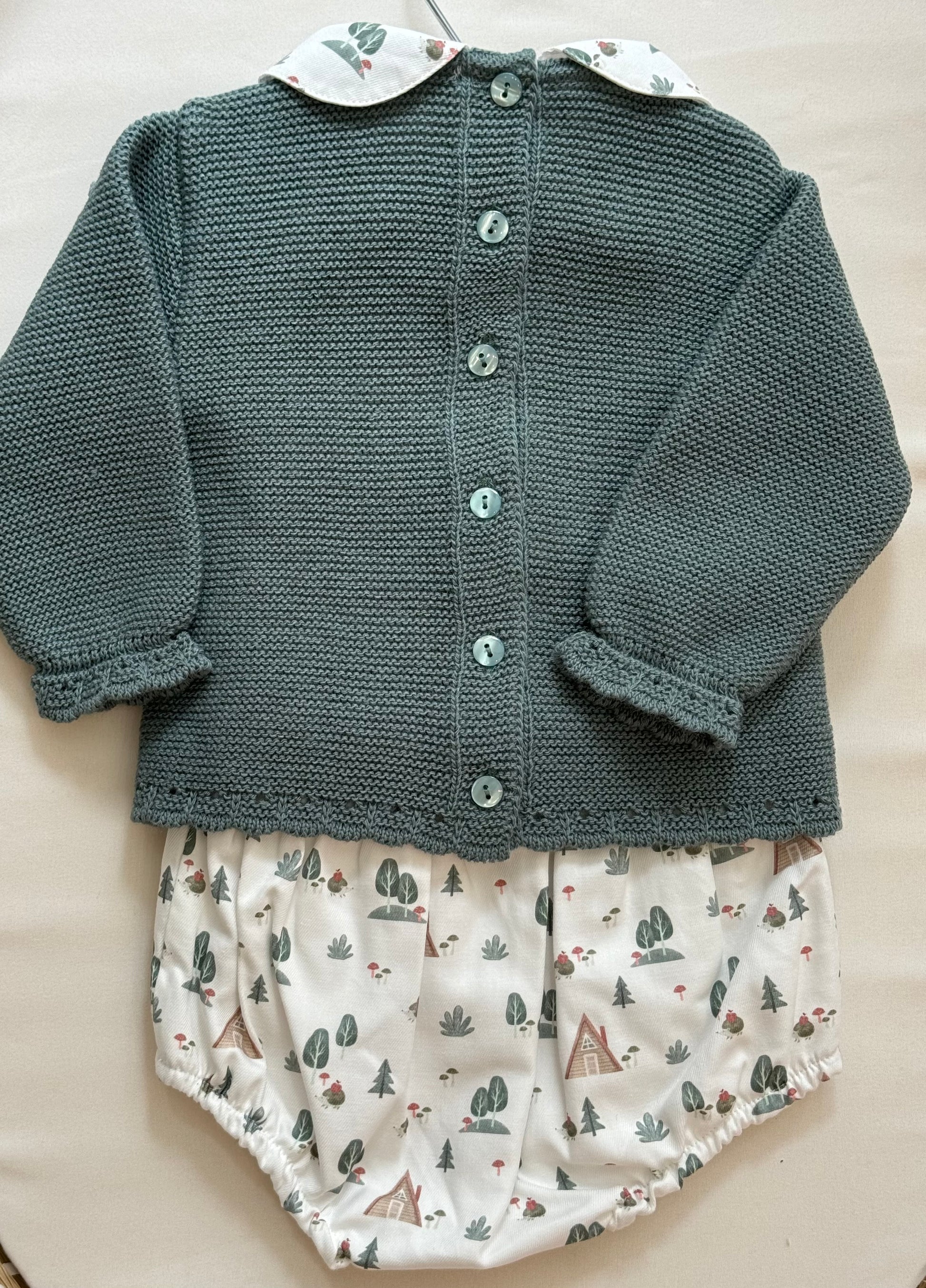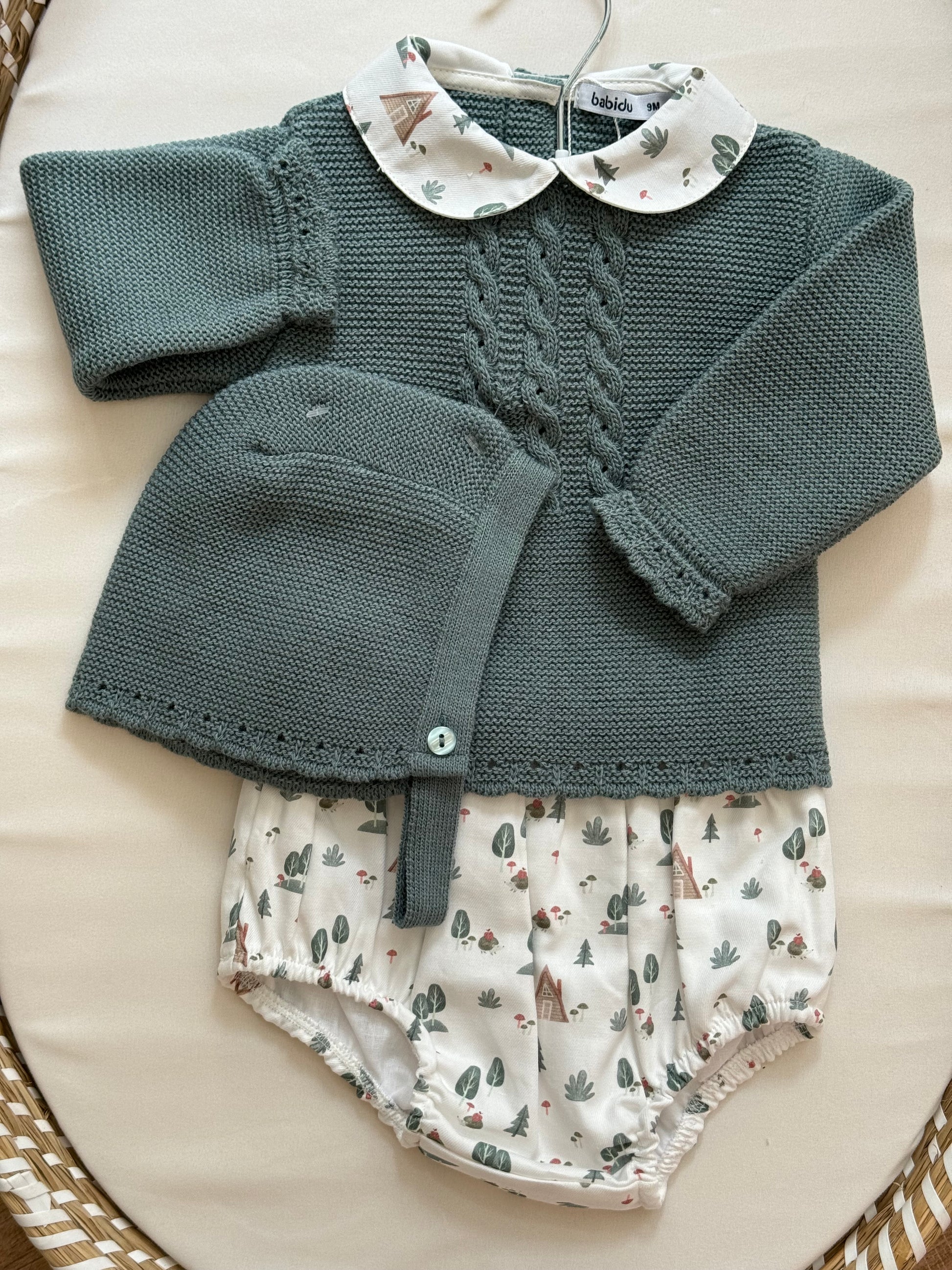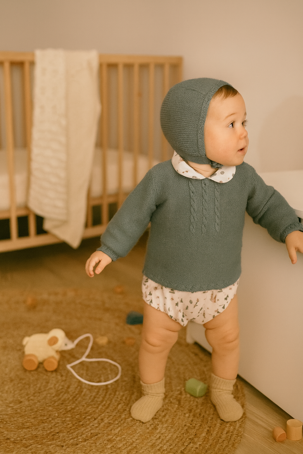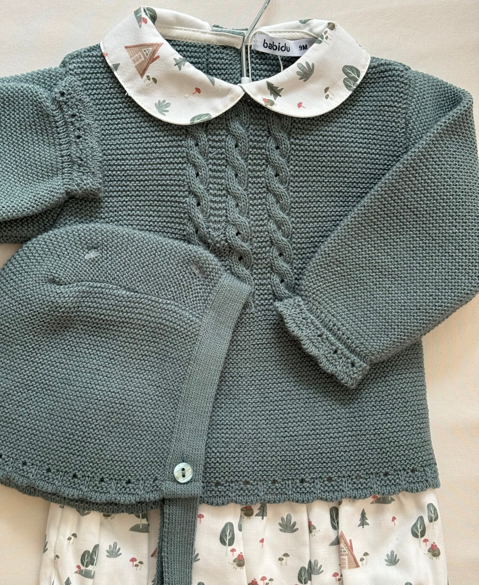 Pagliaccetto in maglia calda traforata e cotone caldo con cuffietta in coordinato.