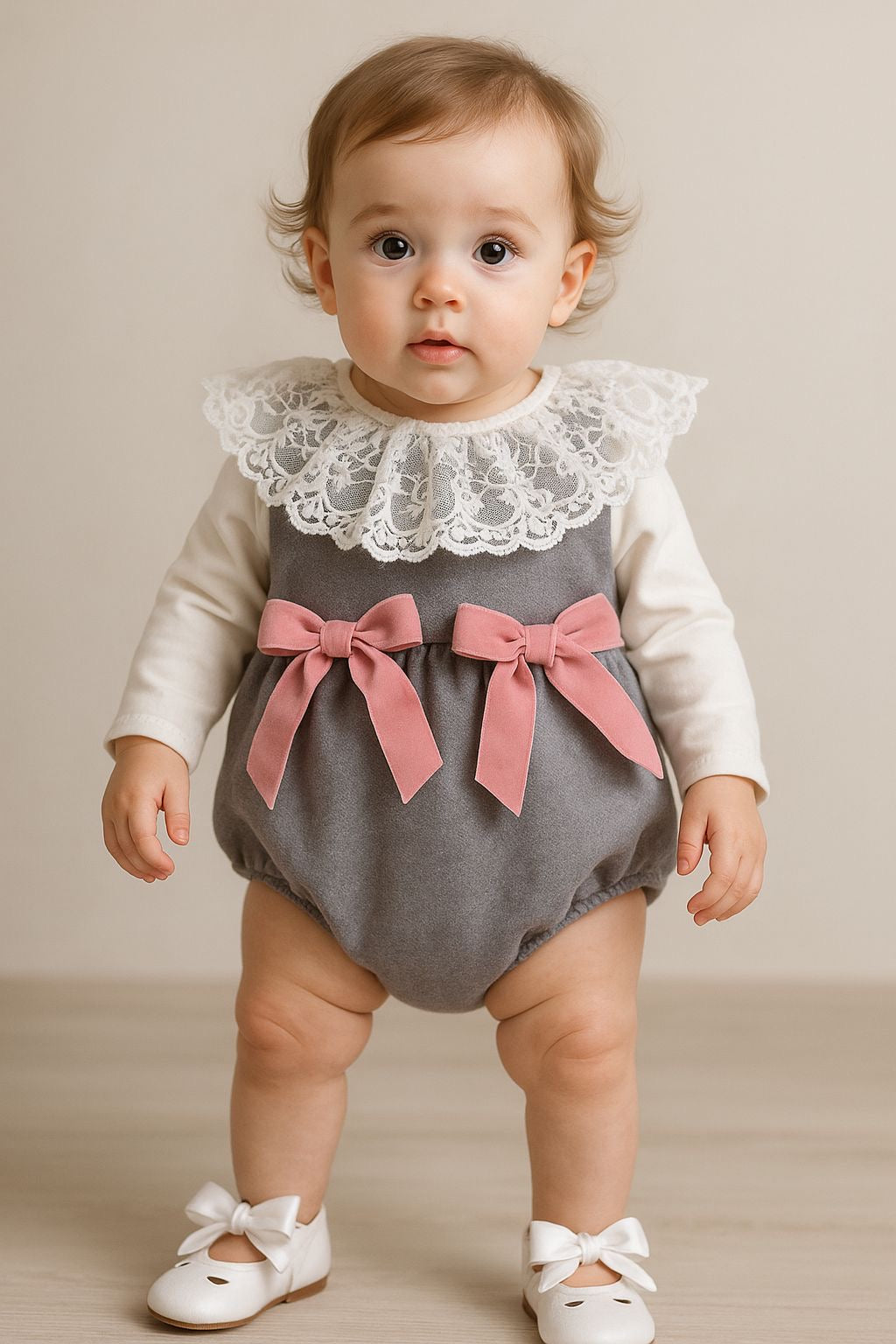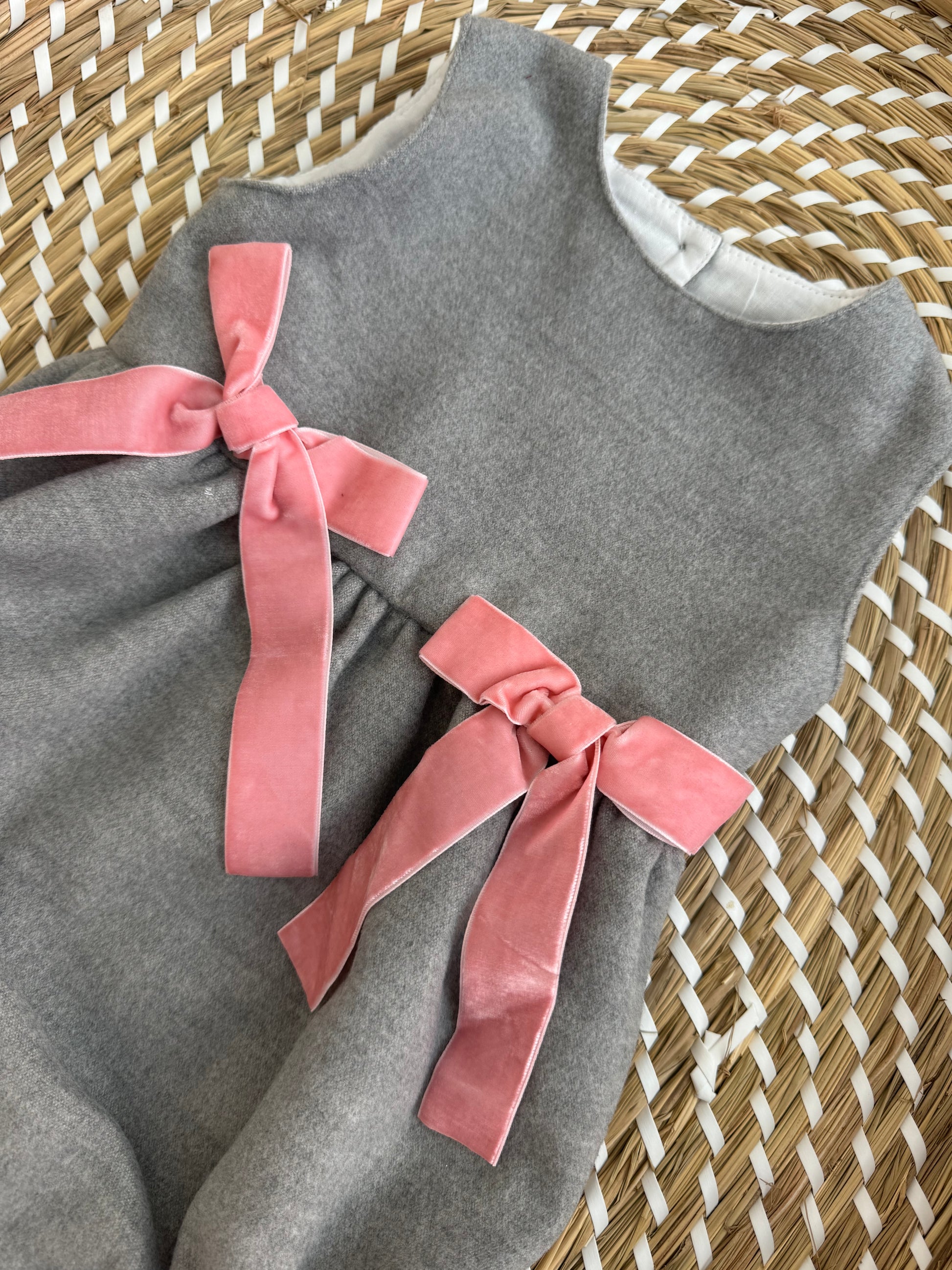 Pagliaccetto in flanellina morbida in grigio chiaro con fiocchetti in velluto rosa