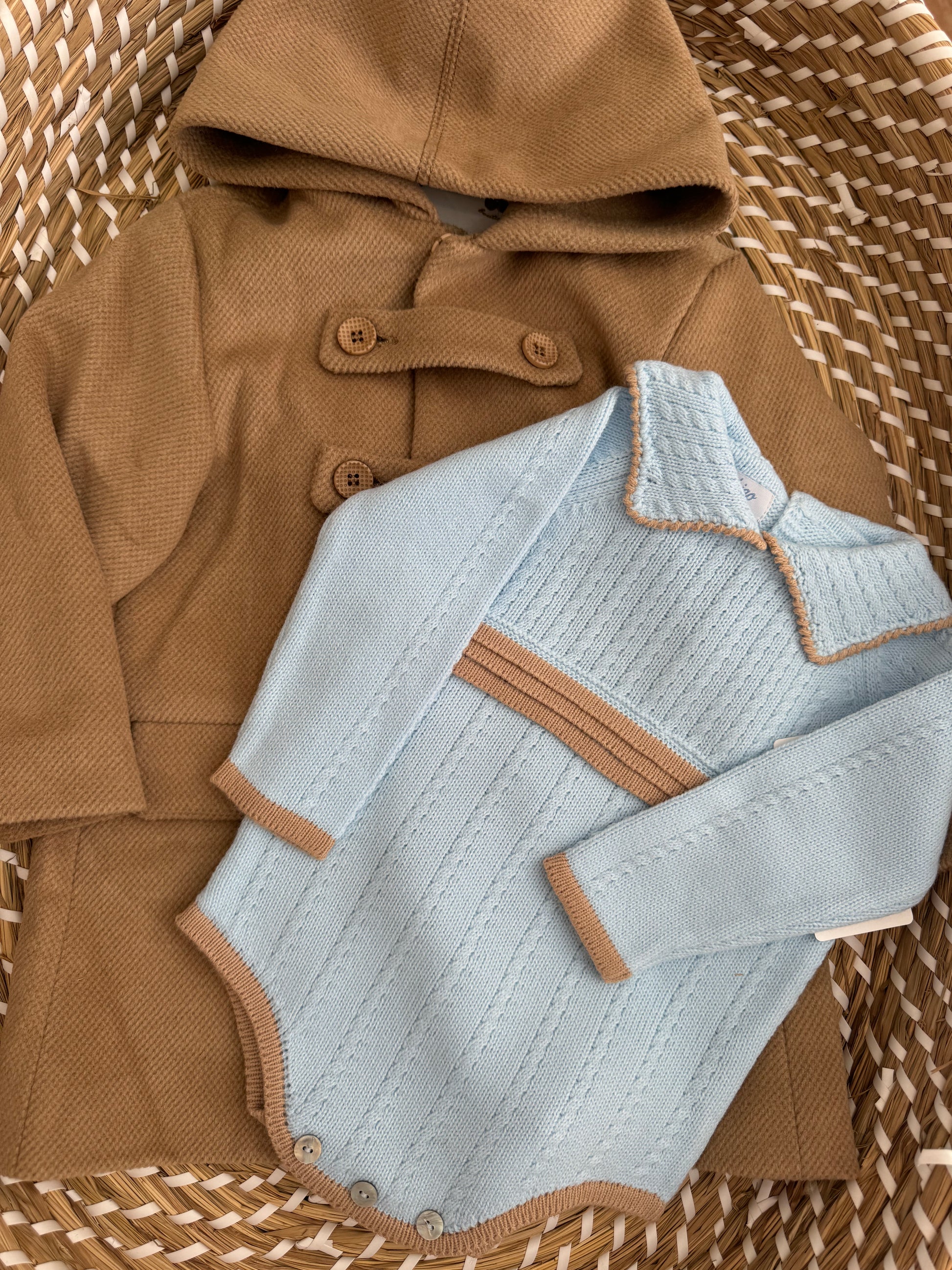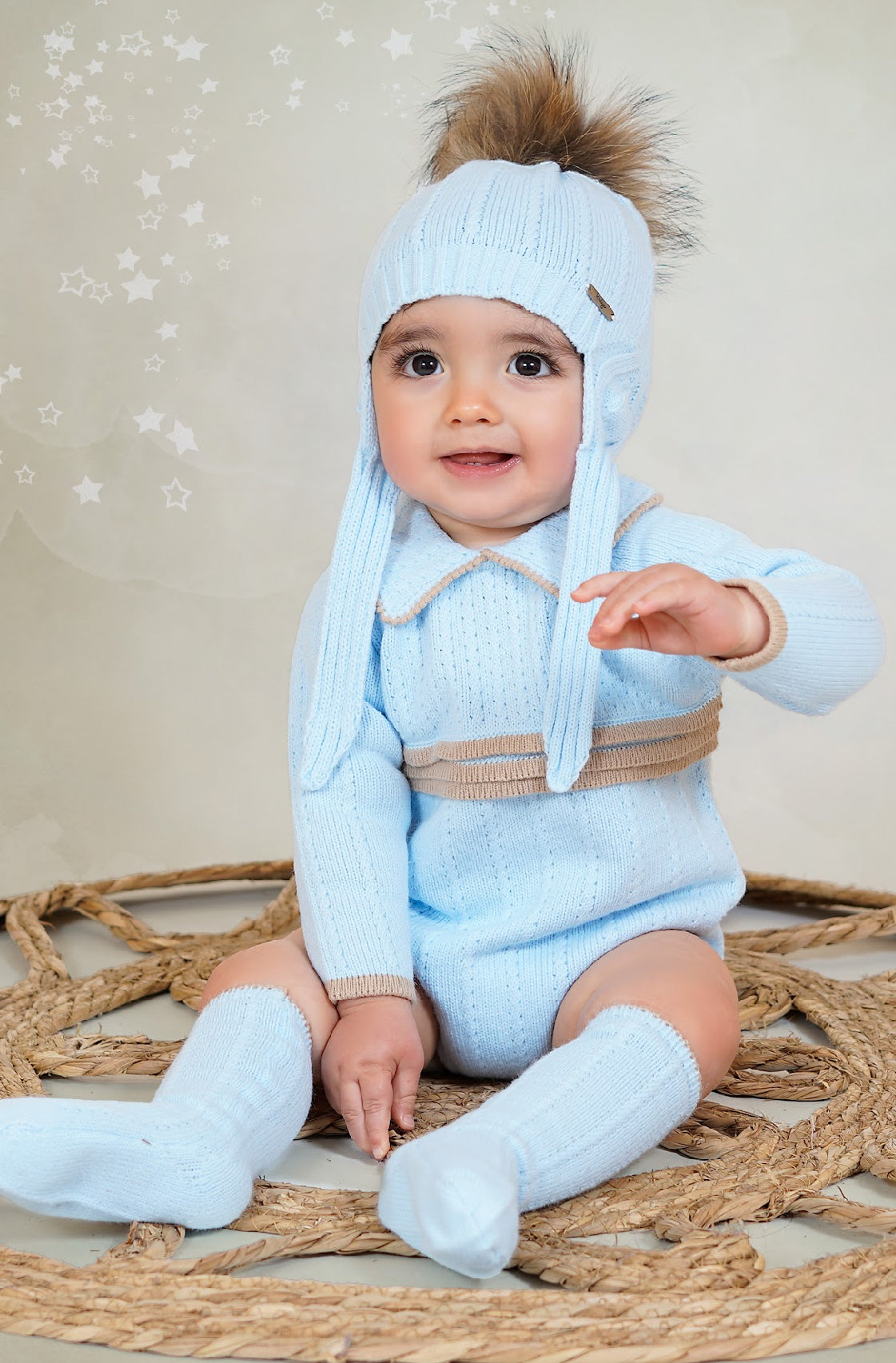 Pagliaccetto in calda maglia azzurro con contrasto in color biscotto