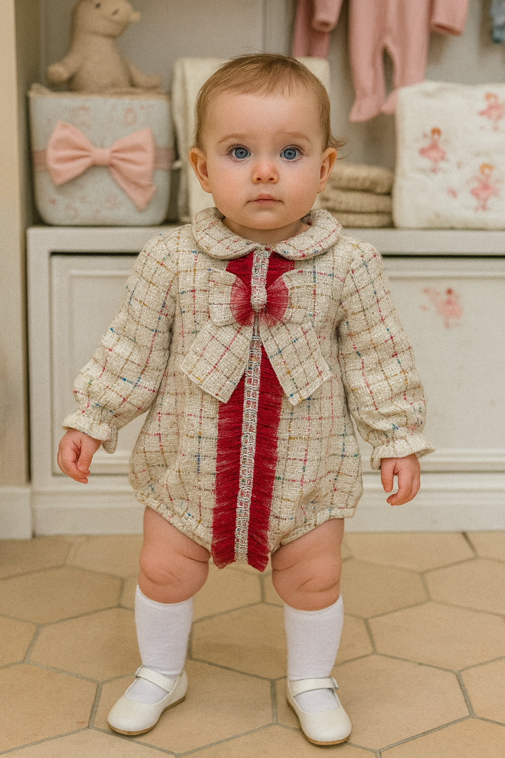 Nel complesso, è un pagliaccetto dal gusto classico e ricercato, perfetto per cerimonie o feste invernali, che unisce stile sartoriale e dolcezza infantile.