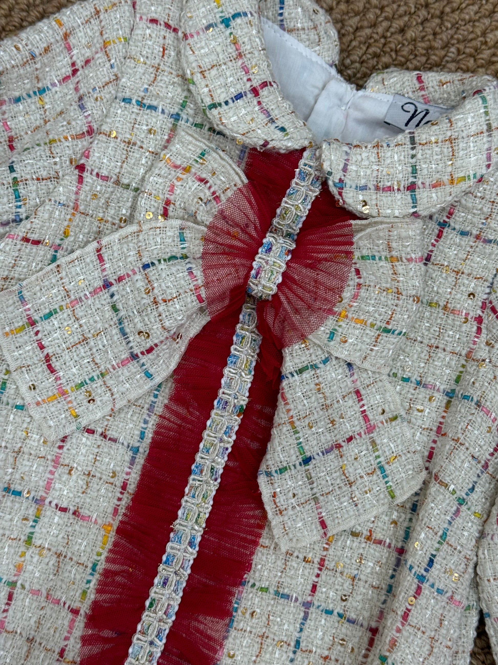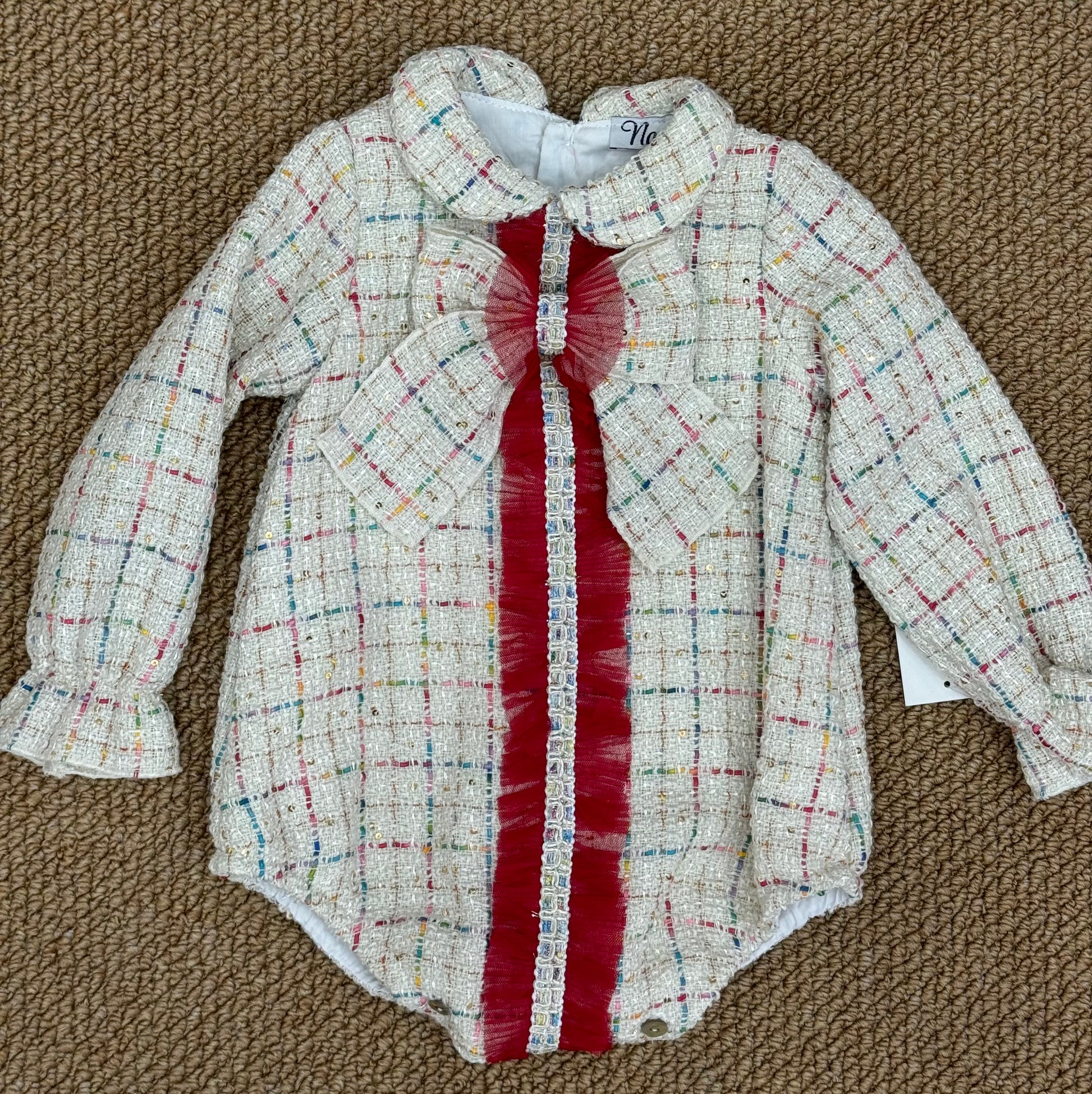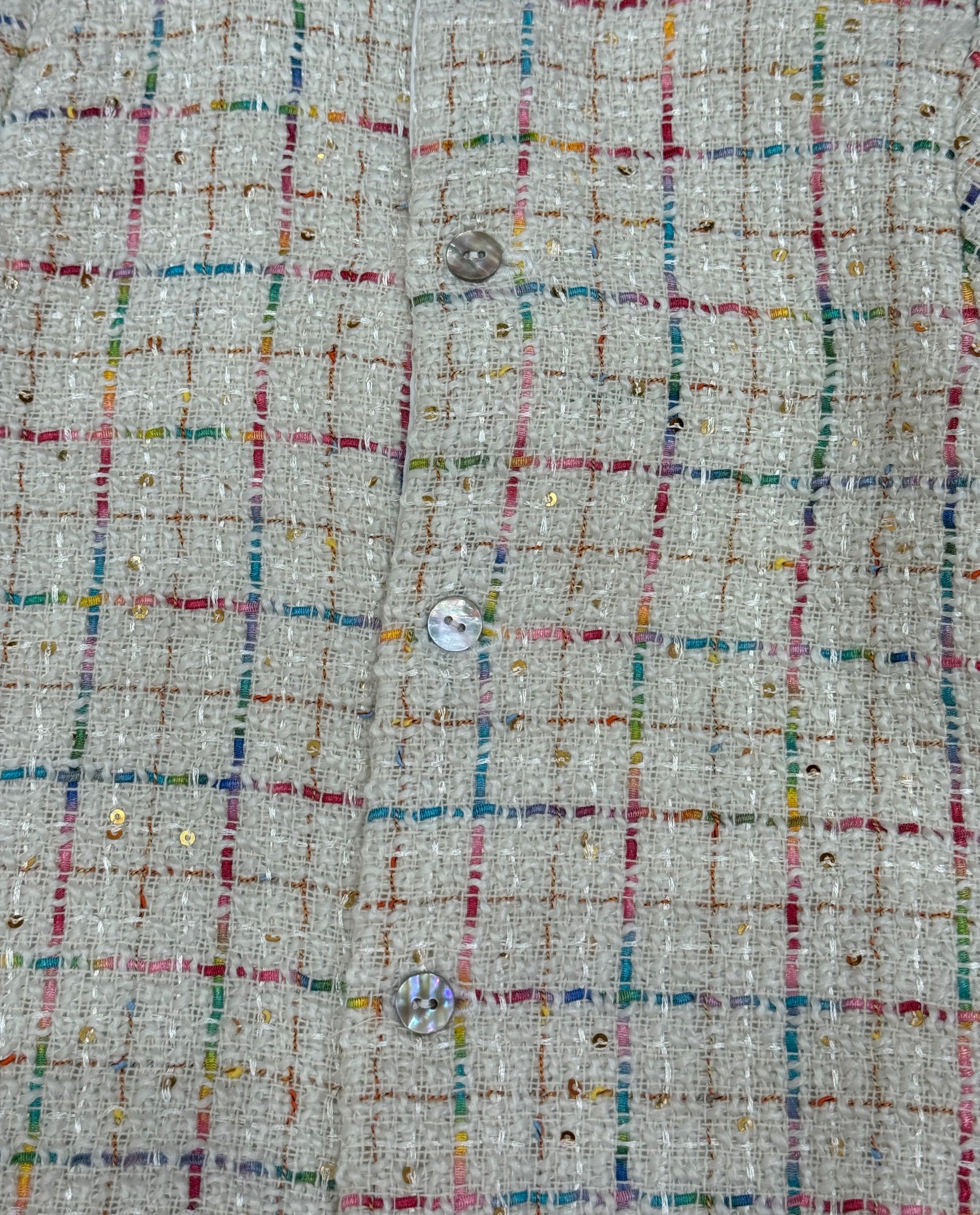Il pagliaccetto è un capo elegante, realizzato in un prezioso tessuto tweed multicolor su base panna, con filati sottili nei toni del rosso, giallo, verde e blu che creano un delicato effetto intrecciato.
