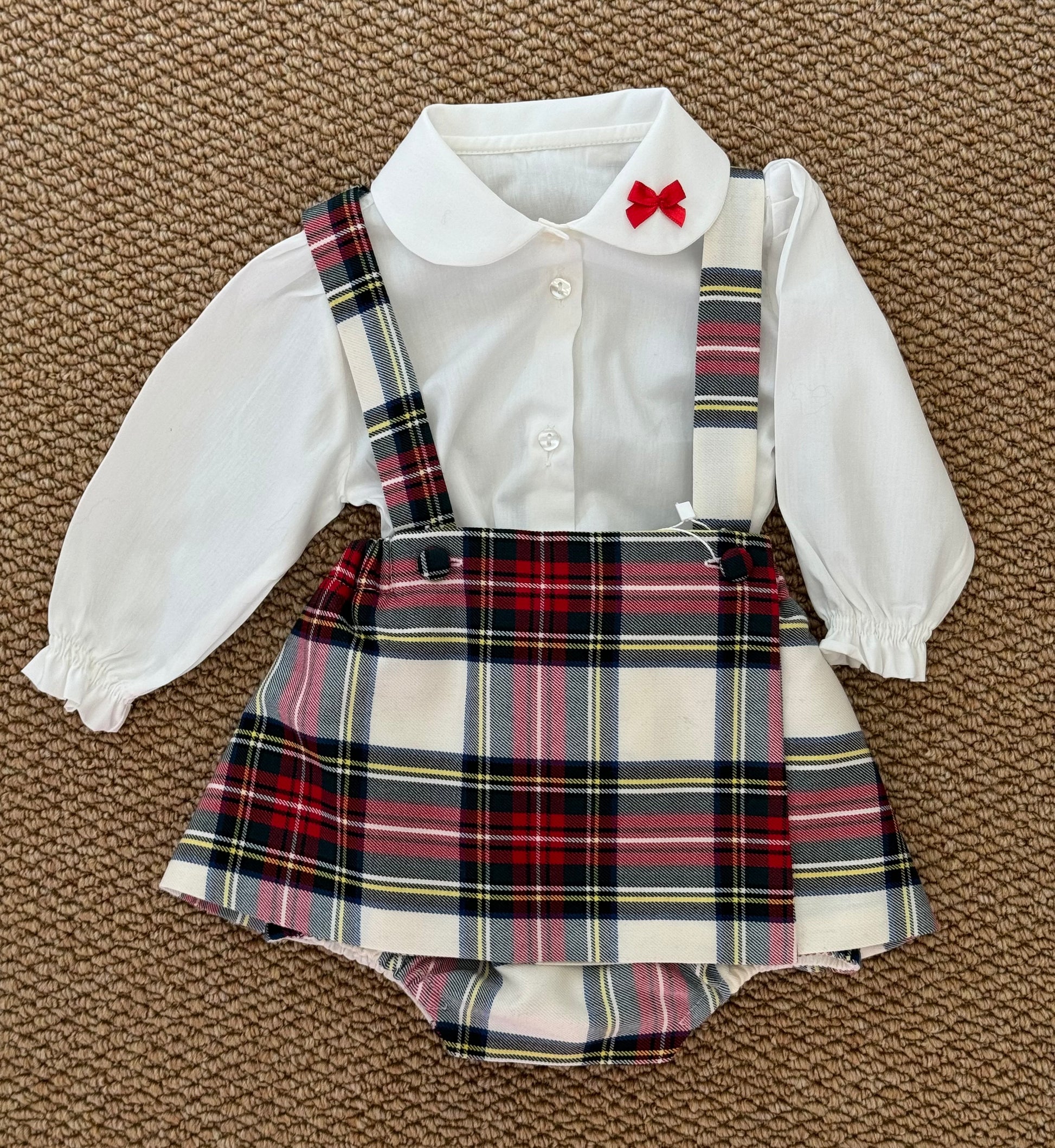 Elegante salopette in tessuto tartan , effetto minigonna , con camicia bianca impreziosita da collo bebè con fiocchetto rosso e graziose maniche sormontate da volant.