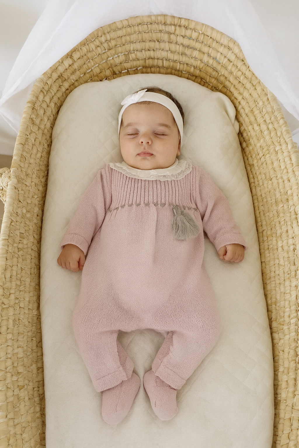 - Un capo che unisce tradizione e modernità, dal fascino intramontabile. Il contrasto tra il rosa cipria e i dettagli tortora lo rende elegante e versatile, ideale per corredini.