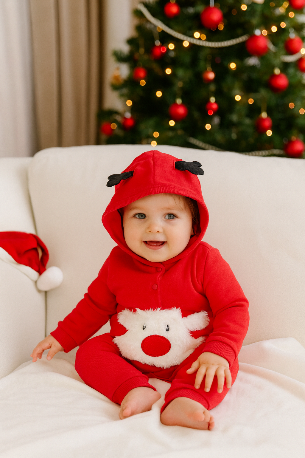 Tutina natalizia con cappuccio in felpa all interno calda e comoda ideale per le sue feste Natalizie.