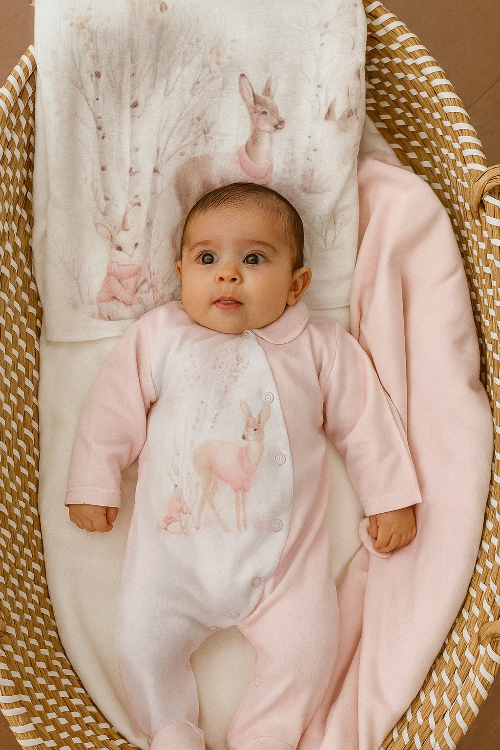 Questa tutina intera in cotone è perfetta per la tua neonata! Con una stampa romantica di foresta e un comodo collo tondo, questa tutina è una scelta versatile per il corredino della tua bambina .La chiusura sul davanti rende il cambio pannolino facile e veloce.