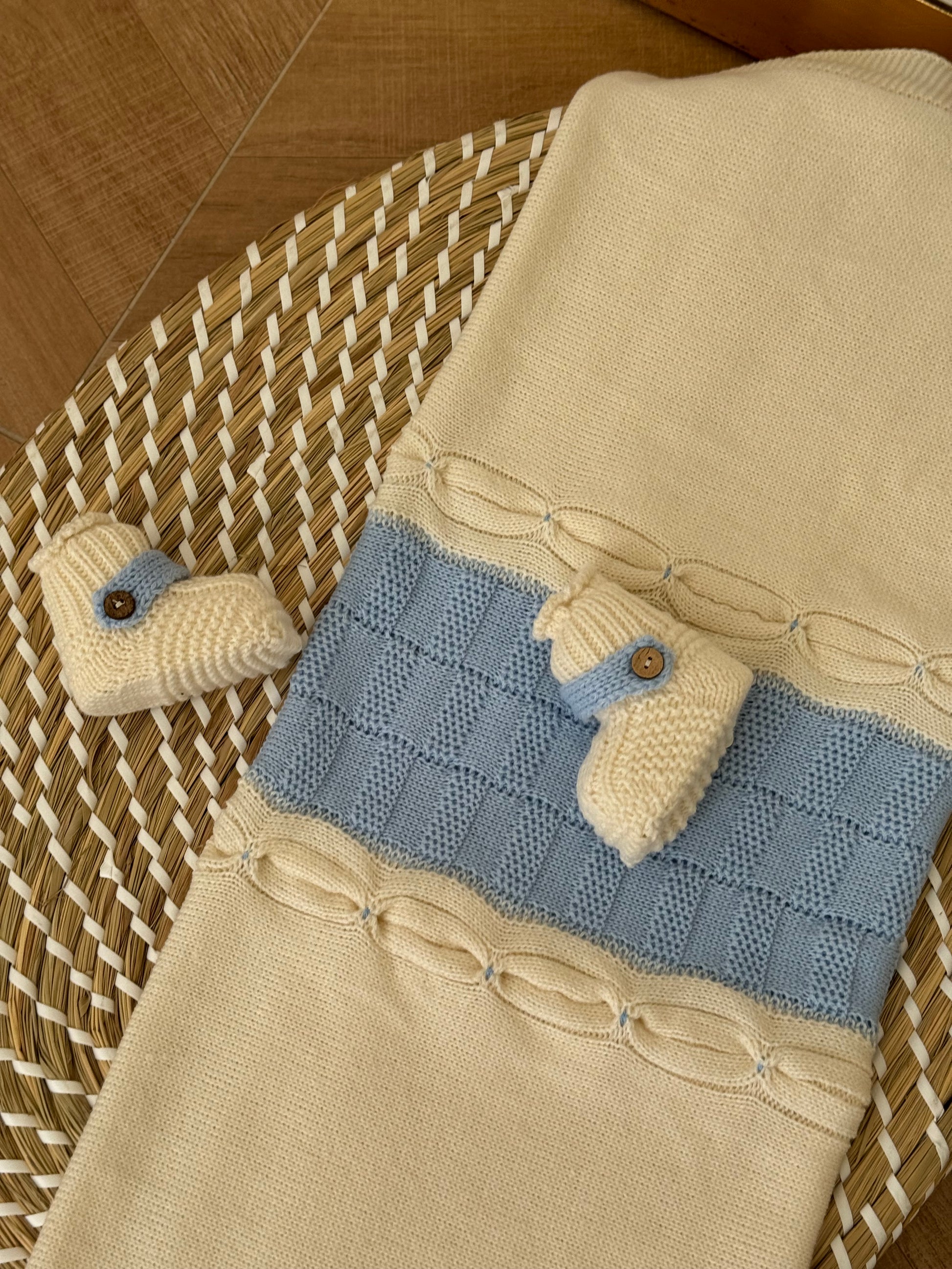 Completa l’uscita clinica una copertina in maglia panna, rifinita con lavorazione intrecciata, che avvolge il bambino in un morbido abbraccio.