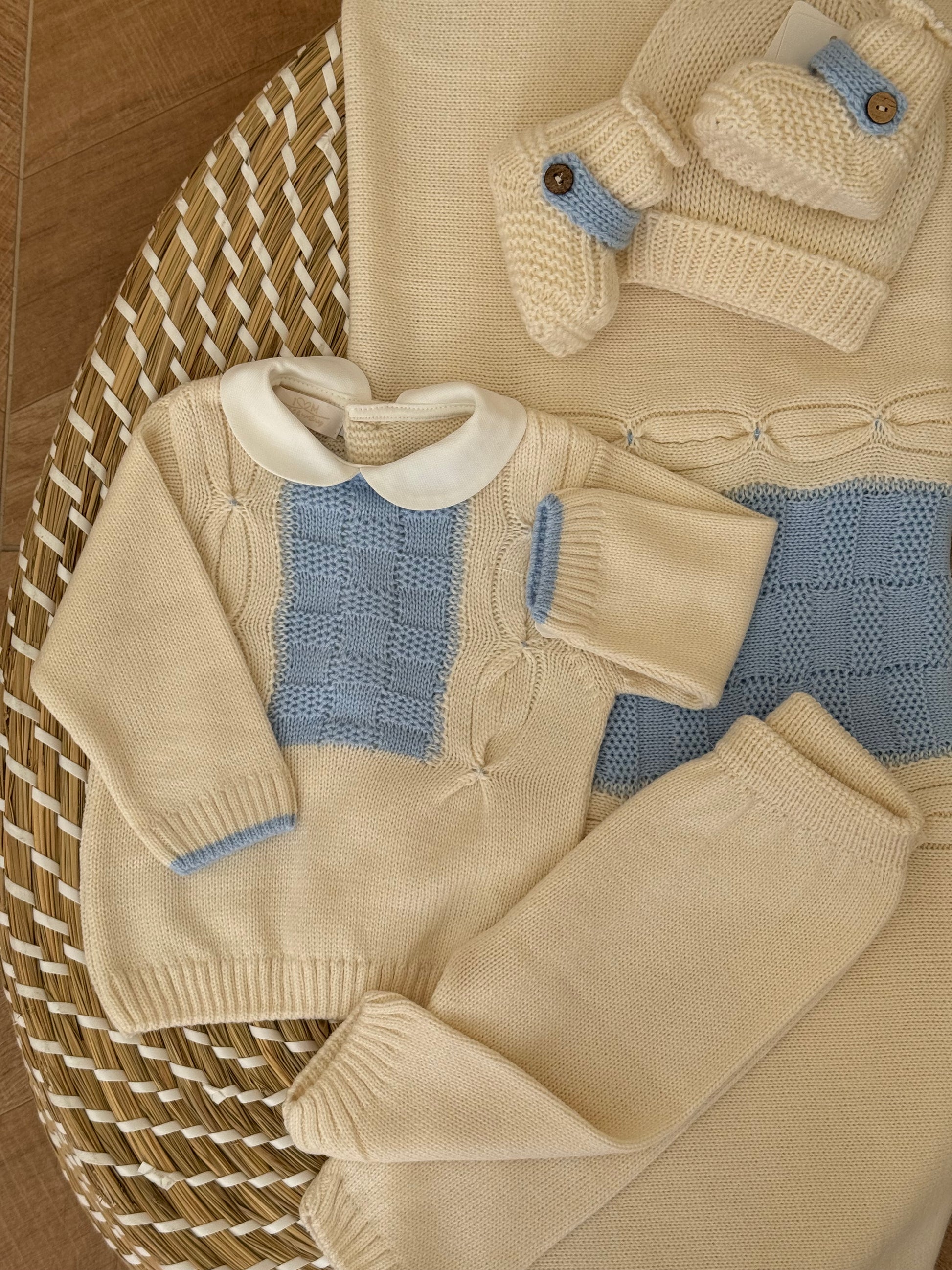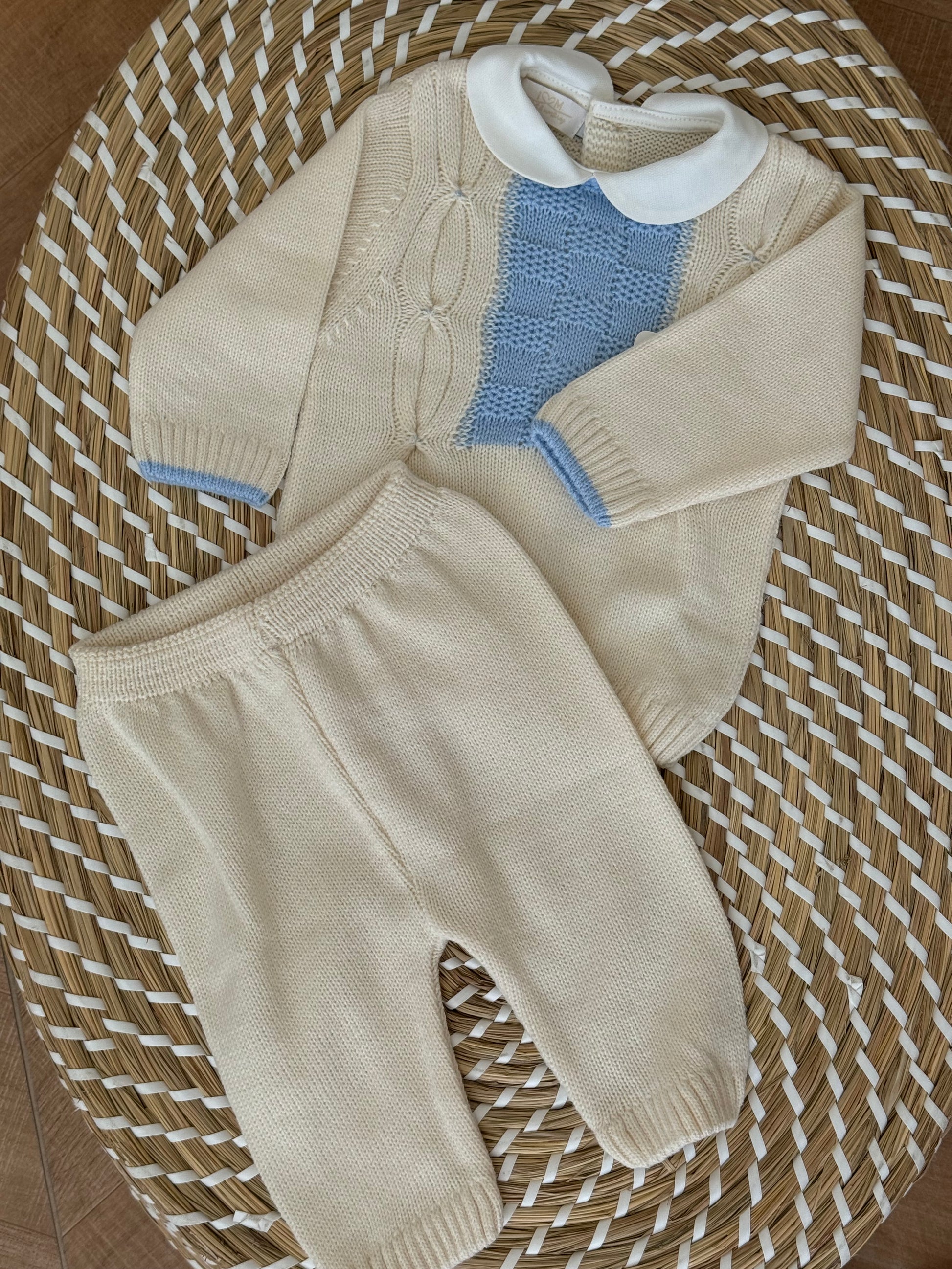 Maglioncino in maglia color panna, con inserto centrale in lavorazione a rombi color azzurro polvere e colletto bianco in cotone liscio, che dona un tocco elegante e tradizionale.