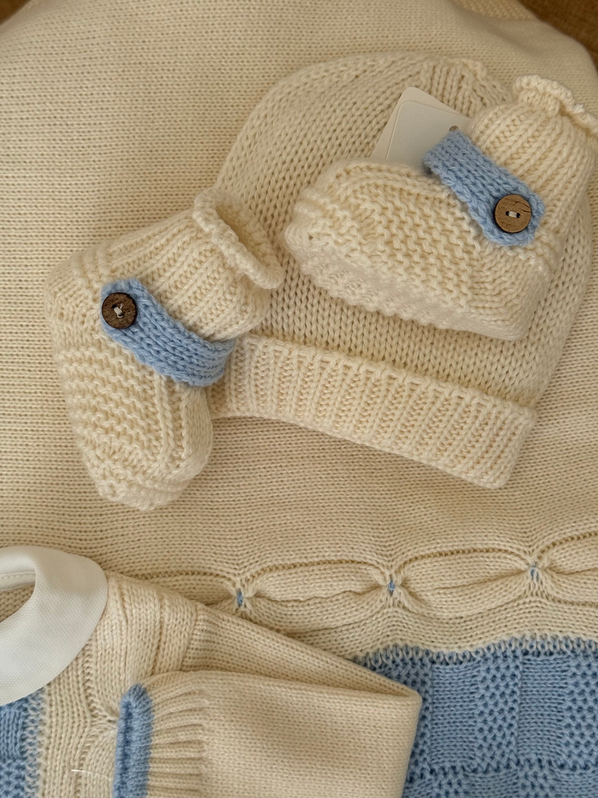 Cappellino in maglia panna, abbinato a scarpine coordinate con risvolto azzurro e piccolo bottone in legno, per un effetto dolce e curato nei dettagli.