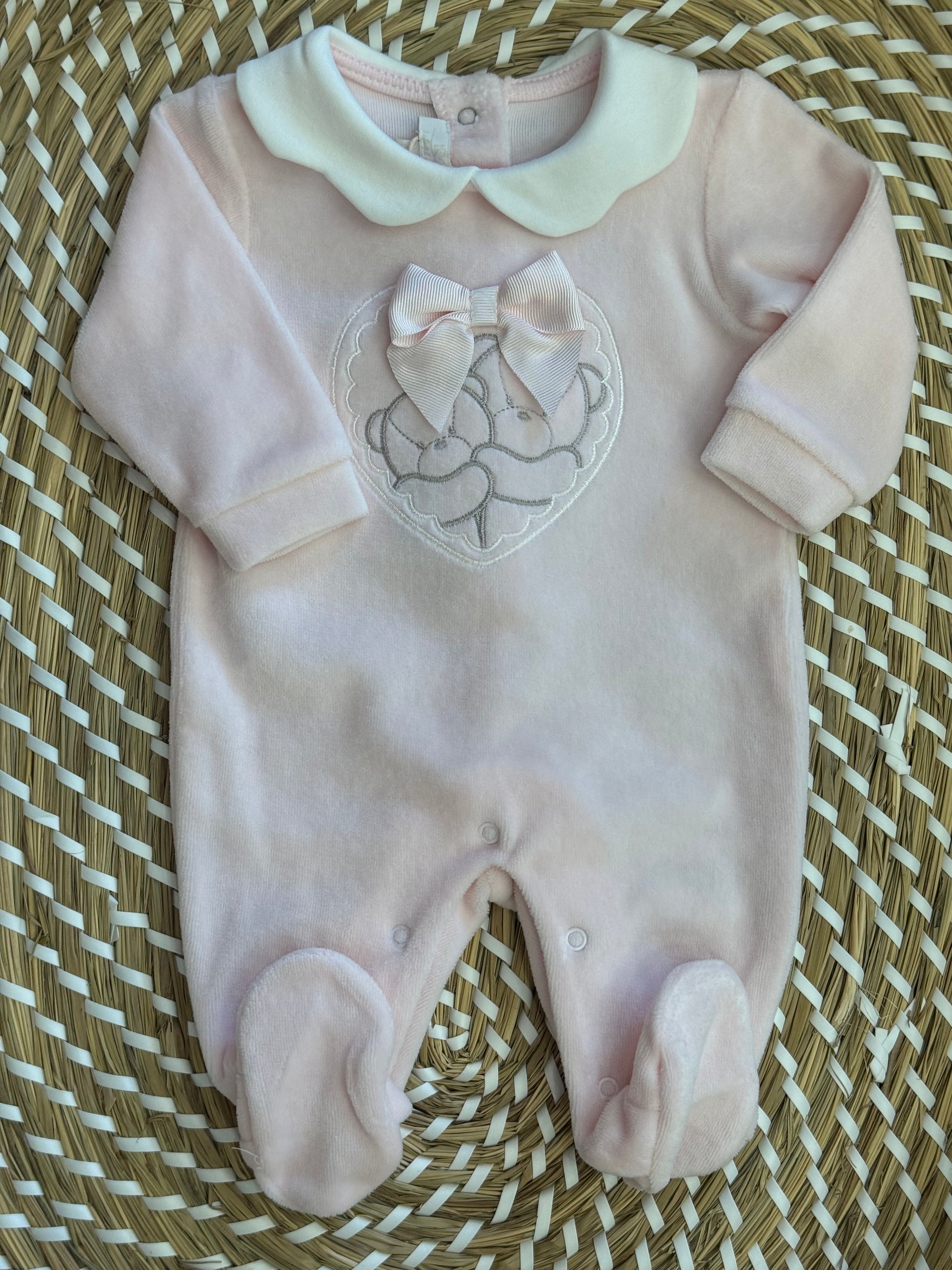 - Tutina con piedini coperti In morbida ciniglia rosa chiaro, con colletto bianco arrotondato.