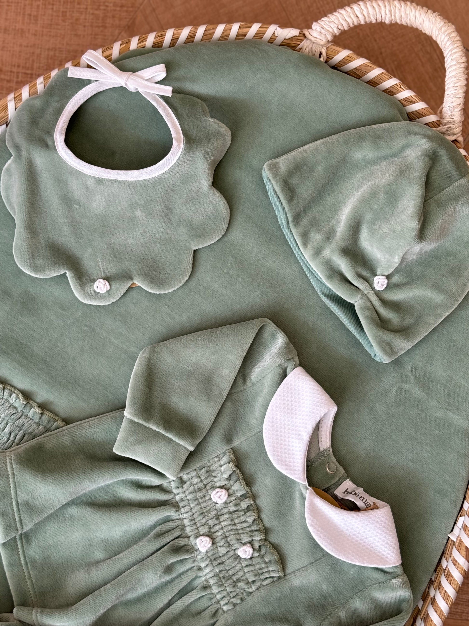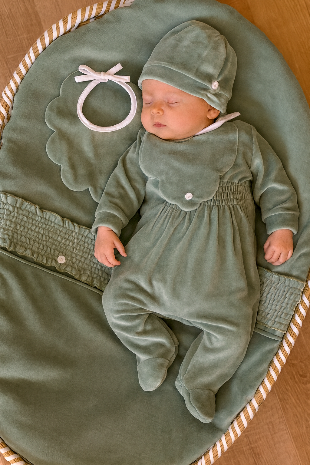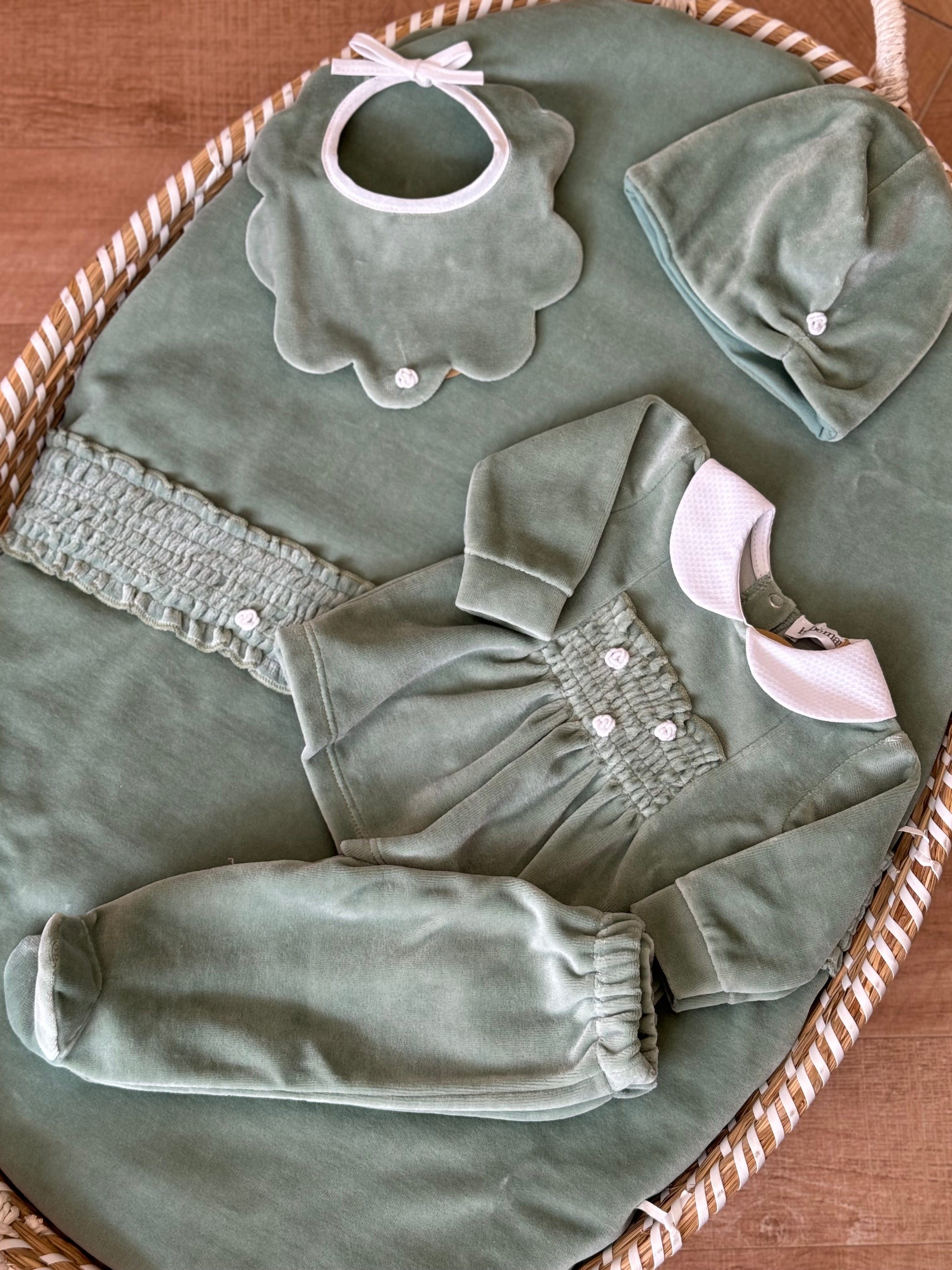 il set comprende: completo clinico, coperta,cappello modello turbante e bavetta.