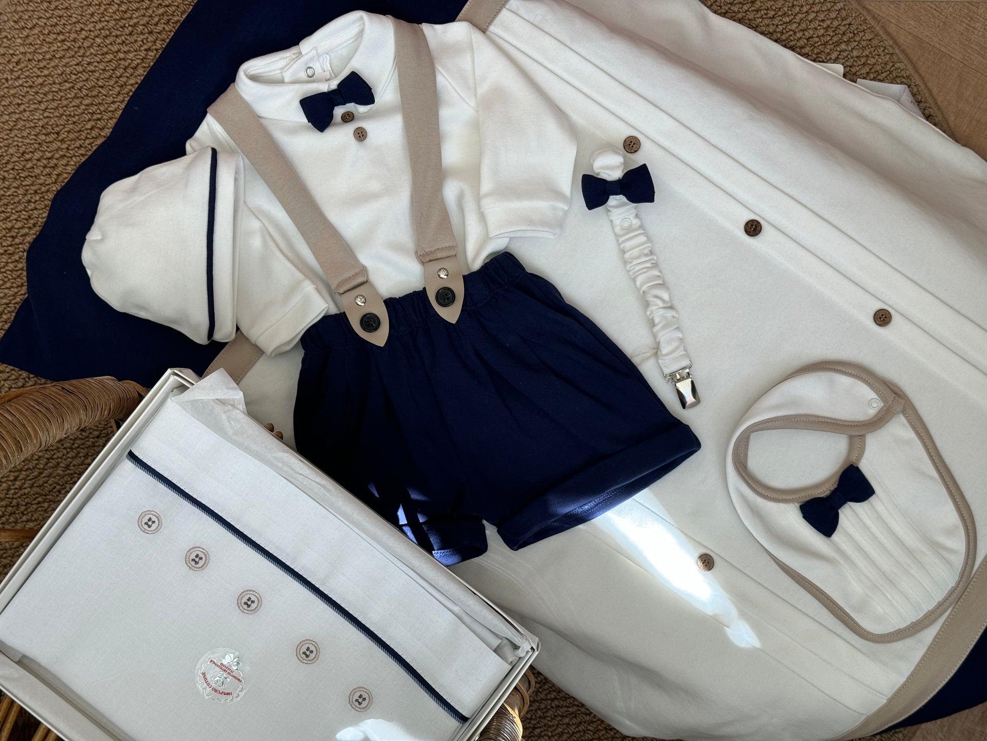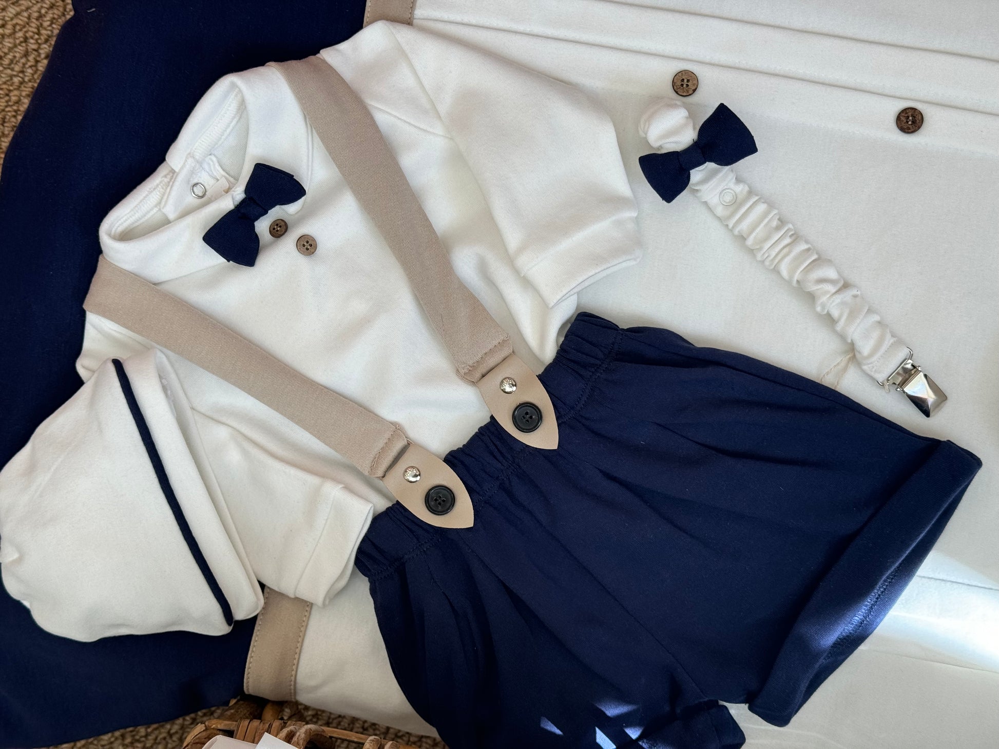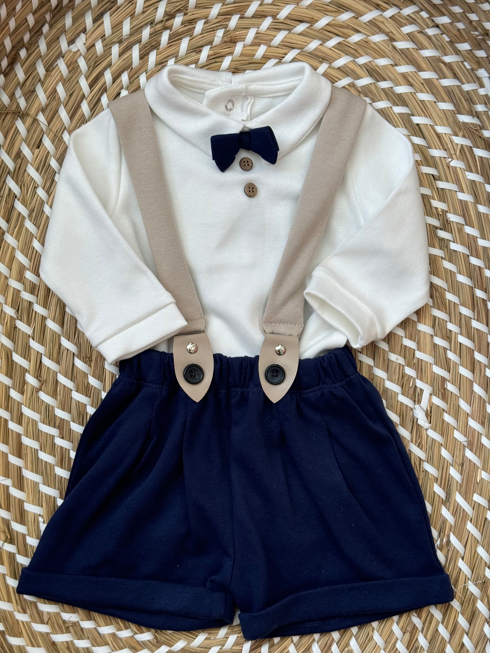 comprende: completo con bretelle , maglietta/body con papillon cucinato e bottoncini in legno.