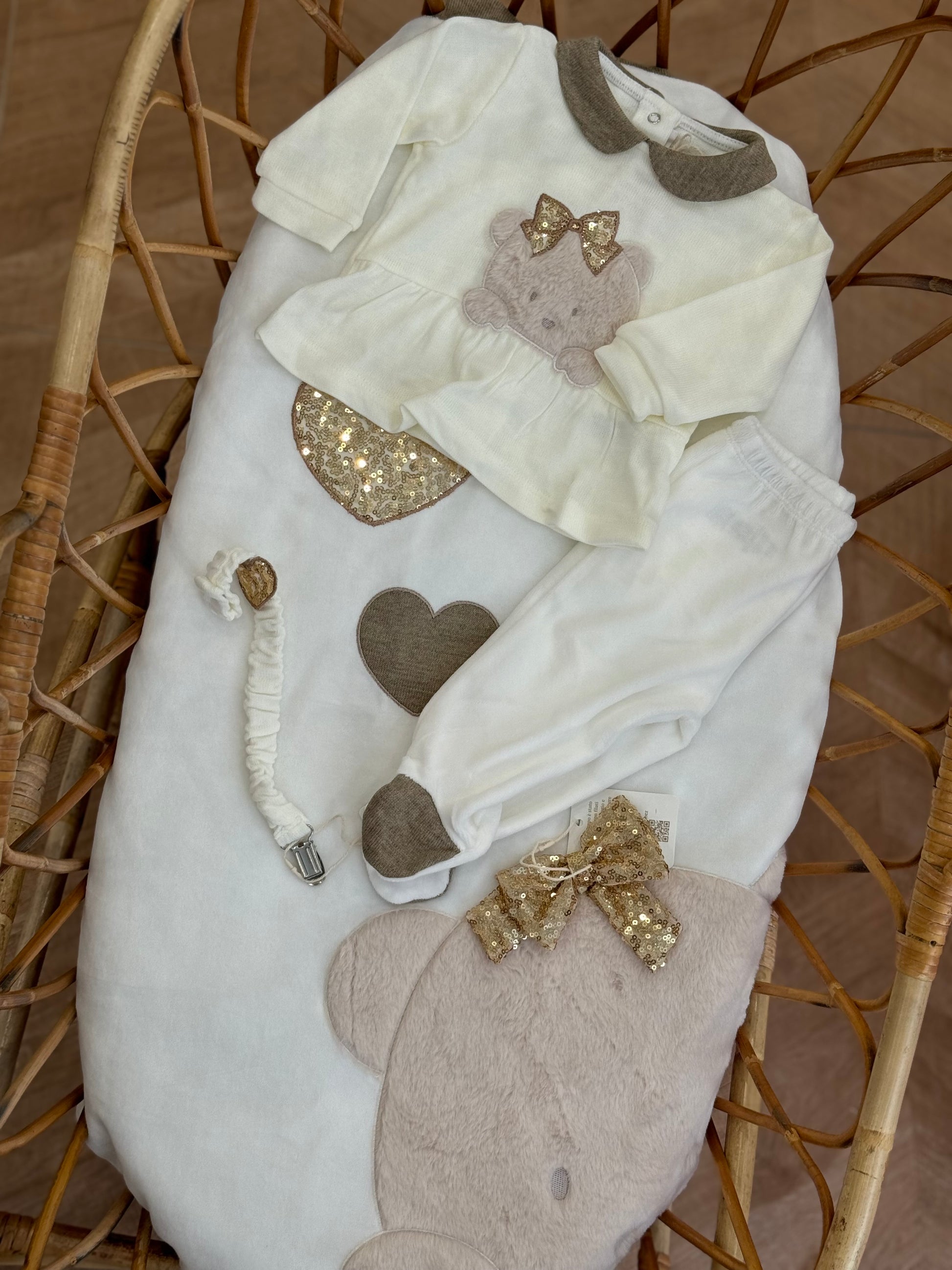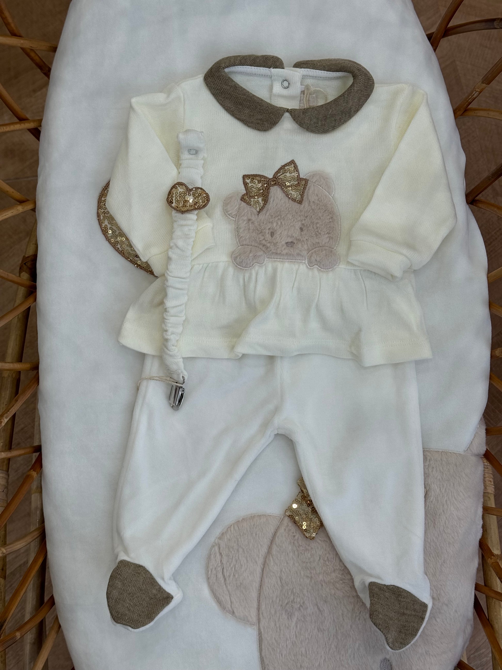 Uscita clinica in calda ciniglia con dettagli in micro paillettes e fantasia teddy.